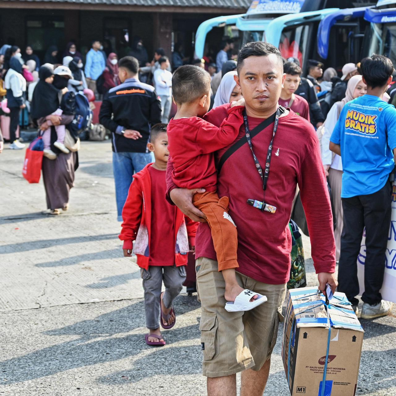 (A father is holding his kid while carrying a cardboard box, followed by another kid when they want to travel to hometown to celebrate Eid al-Fitr (Photo/Transportation Ministry))