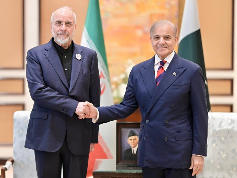 (Speaker of Iranian Consultative Assembly Mohammad Bagher Ghalibaf (left) is welcomed by Pakistani Prime Minister Muhammad Shehbaz Sharif in Islamabad (Photo/Pakistani PM Office))